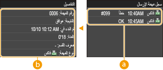 ![]() <سجل مهمة الإرسال>/<سجل مهام الاستلام>يعرض قائمة من المستندات التي يتم إرسالها واستلامها. يتم عرض <OK> عندما يتم إرسال مستند أو استلامه بنجاح، ويتم عرض <خطأ> عند فشل إرسال مستند أو استلامه بسبب إلغائه أو لوجود بعض الأخطاء.