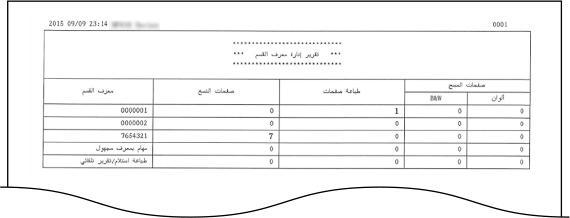 عندما يتم تمكين إدارة أرقام ID للقسم، يمكنك التحقق من الحجم الكلي للمطبوعات لكل من <معرف القسم> من خلال طباعة تقرير إدارة أرقام ID للقسم. من خلال التحقق من مجاميع المطبوعات، يمكنك إدارة إمدادات الورق والحبر بصورة أفضل.