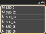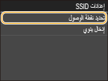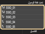 يمكنك البحث عن الموجهات اللاسلكية (أو نقاط الوصول) المتاحة للاتصال وتحديد واحد منها من شاشة الجهاز. فيما يتعلق بمفتاح الشبكة، أدخل مفتاح WEP أو PSK. قبل تحديد موجه لاسلكي، تحقق من معلومات الإعداد المطلوبة وقم بتدوينها، بما في ذلك مفتاح SSID ومفتاح الشبكة (