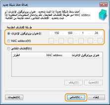 انقر فوق [تحديث]. وفي حالة استمرار المشكلة، حدد [عنوان بروتوكول الإنترنت] أو [MAC address]، ثم أدخل عنوان IP أو عنوان MAC الخاص بالجهاز (مشاهدة إعدادات الشبكة)، ثم انقر فوق [التالي].
