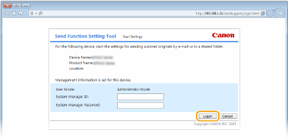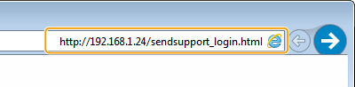 أدخل "http://(عنوان IP الخاص بالجهاز)/sendsupport_login.html" في حقل العنوان في متصفّح شبكة الإنترنت، واضغط المفتاح [ENTER].