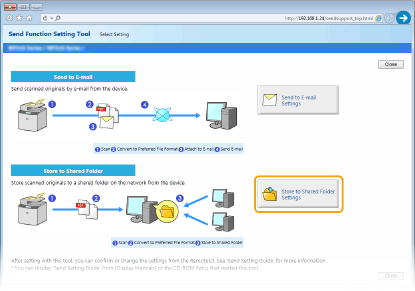 ضبط إعدادات SMB). لضبط إعدادات الجهاز لحفظ مستنداتك الممسوحة ضوئيًا في مجلد مشترك في الشبكة عبر SMB، حدّد موقع المجلد المشترك من جهاز كمبيوتر مسبقًا. يشرح هذا القسم كيفية تحديد موقع الحفظ باستخدام أداة إعداد وظيفة الإرسال Send Function Setting Tool.
