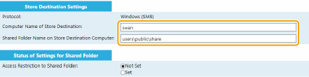 انقر على زر الاختيار [Not Set] أو [Set] بحيث يطابق القيود على العنوان المحدّدة للمجلد المشترك. عندما يكون [Set] مختارًا، أدخل اسم المستخدم في مربع نص [Registered User Name] وكلمة السر (كلمة المرور) في مربع نص [Password to Access].