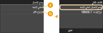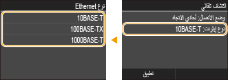 حدد نوع Ethernet.![]() ![]() عندما يتم ضبط <وضع الاتصال> على <أحادي الاتجاه>، فإنه لا يمكنك تحديد <1000BASE-T>.