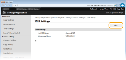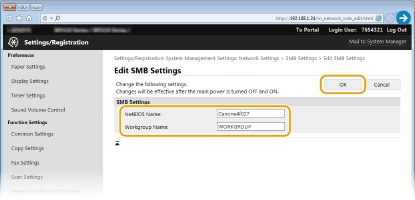 Server Message Block (SMB) هو بروتوكول لمشاركة الموارد، مثل الملفات والطابعات، مع أكثر من جهاز واحد في شبكة ما. يستخدم الجهاز SMB لتخزين المستندات الممسوحة ضوئيًا في مجلد مشترك. قد تحتاج لإعداد اسم NetBIOS واسم مجموعة العمل، وذلك تبعًا لشبكتك.