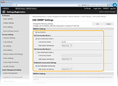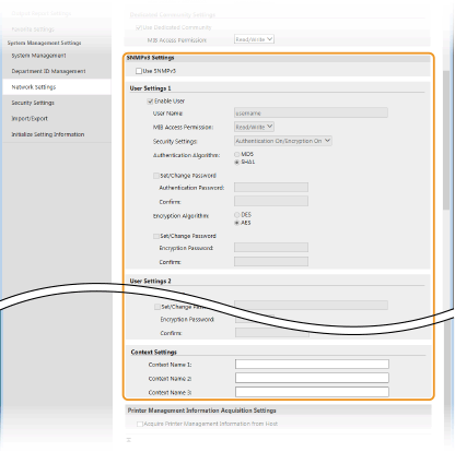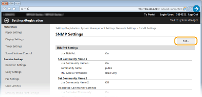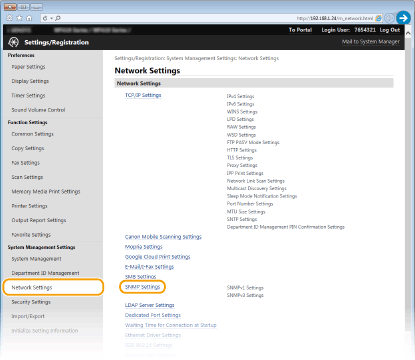 Simple Network Management Protocol (SNMP) هو بروتوكول لمراقبة والتحكّم في أجهزة الاتصال في شبكة باستخدام قاعدة معلومات الإدارة Management Information Base (MIB). يدعم الجهاز SNMPv1 و والإصدار المحسّن أمنيًا SNMPv3. يمكنك التحقق من حالة الجهاز من خلال جهاز كمبيوتر عندما تطبع مستندات أو تستخدم واجهة المستخدم عن بعد Remote UI. يمكنك تمكين SNMPv1 أو SNMPv3، أو كليهما في نفس الوقت. حدّد الإعدادات لكل إصدار حسبما يلائم بيئة شبكتك والغرض من الاستخدام.