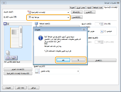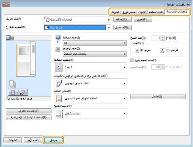 انقر على الحقول [الإعدادات الأساسية] أو [إعداد الصفحة] أو [الإنهاء] أو [مصدر الورق] أو [الجودة] لتحديد إعدادات الطباعة على كل شاشة حسب الحاجة.
