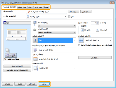 انقر على الحقول [الإعدادات الأساسية] أو [إعداد الصفحة] أو [الإنهاء] أو [مصدر الورق] أو [الجودة] لتحديد إعدادات الطباعة على كل شاشة حسب الحاجة.