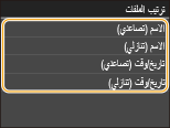 ![]() ![]() عندما تختار <تاريخ/وقت (تصاعدي)> أو <تاريخ/وقت (تنازلي)>، يتم فرز الملفات بناءً على تواريخ وتوقيتات تعديل الملفات.