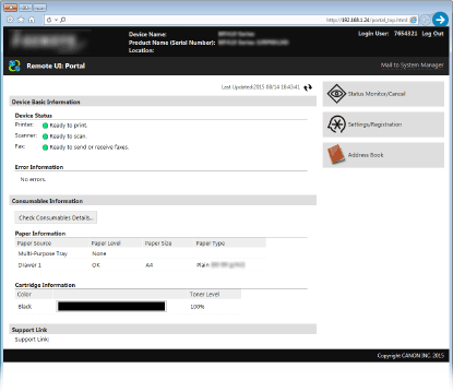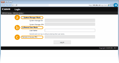 يمكنك تنفيذ جميع عمليات تشغيل وإعدادات واجهة المستخدم عن بعد Remote UI. وإذا تم تحديد معرف إدارة النظام، أدخل المعرف الصحيح في [System Manager ID] ورمز PIN الصحيح في [System Manager PIN].