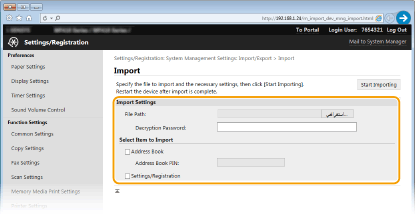 انقر فوق [Browse] وحدد الملف، ويمكنك فقط استيراد ملف معلومات تكوين جهاز بتنسيق (*.dcm) وملف "دفتر عناوين" Canon بتنسيق (*.abk)، وإذا حددت نوع ملف "دفتر عناوين" Canon، فلن تحتاج إلى تعيين أية عناصر أخرى.