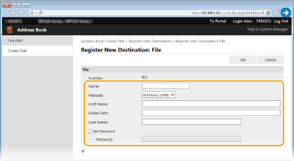 يمكنك تسجيل الوجهات في دفتر عناوين الجهاز باستخدام جهاز الكمبيوتر وتحرير معلومات الوجهات المسجلة. حدد المجلد المشترك أو وجهة خادم FTP هنا.