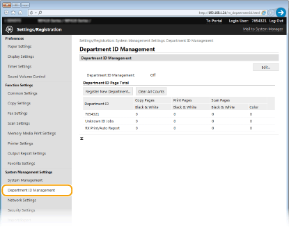 [Department ID Page Total]يمكنك التحقق من العدد الكلي للصفحات المنسوخة أو المطبوعة أو الممسوحة ضوئيًا أو المرسلة عبر الفاكس لكل رمز معرف القسم.
