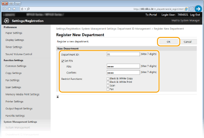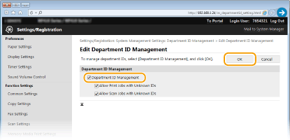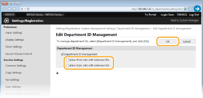 انقر للتحقق مما إذا كان قد تم إدخال المعرف ورمز PIN الصحيحين. لا تتوفر هذه الوظيفة إذا كان الجهاز والكمبيوتر موصلين عبر منفذ USB أو WSD (خدمات الويب على الأجهزة). [تأكيد المعرف/رمز الحماية للقسم عند الطباعة]/[تأكيد معرف القسم/رمز الحماية عند إرسال الفاكسات]