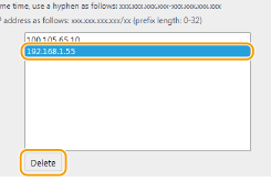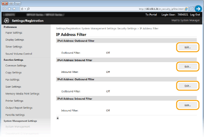 إذا تم إدخال عناوين IP بشكل غير صحيح، قد لا تتمكن من الوصول إلى الجهاز من واجهة المستخدم عن بعد Remote UI، في هذه الحالة تحتاج إلى ضبط <عامل تصفية عنوان IPv4> أو <عامل تصفية عنوان IPv6> على <إيقاف>.