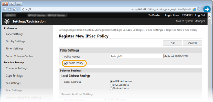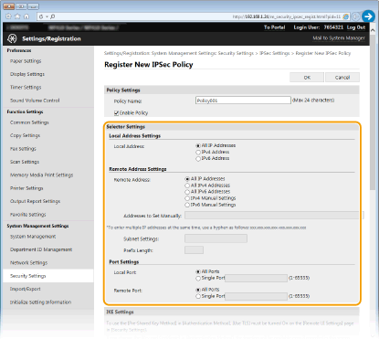 قم باختياره لتحديد عنوان IPv4 مفرد أو مجموعة عناوين IPv4 لتطبيق IPSec. قم بإدخال العنوان IPv4 (أو مجموعة العناوين) في مربع النص [Addresses to Set Manually].
