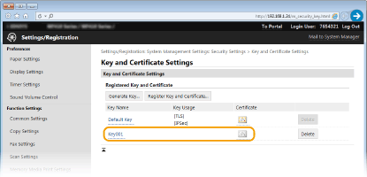 لا يمكن حذف زوج مفاتيح إذا كان مستخدمًا حاليًا لغرض ما، مثل عندما يكون "[TLS]" أو "[IEEE 802.1X]" معروضًا أسفل [Key Usage]. في هذه الحالة، قم بتعطيل الوظيفة أو استبدال زوج المفاتيح قبل حذفه.