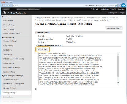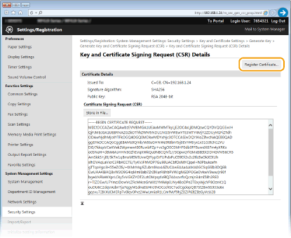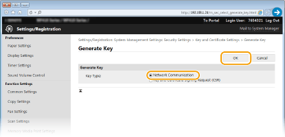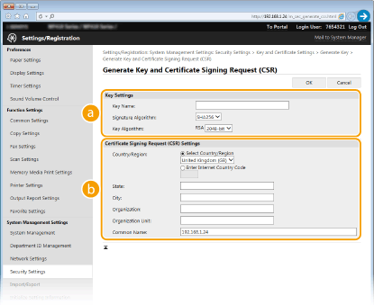 يمكن للجهاز إنشاء زوج مفاتيح عندما يكون ضروريًا للاتصال المشفر عبر بروتوكول أمان طبقة النقل (TLS). ويمكنك استخدام بروتوكول TLS عند الدخول إلى الجهاز من واجهة المستخدم عن بعد Remote UI. ويمكن للجهاز إنشاء ما يصل إلى خمسة أزواج مفاتيح (بما فيها الأزواج المثبتة مسبقًا). يتم استعمال الشهادات ذاتية التوقيع مع أزواج المفاتيح المنشئة في "اتصال الشبكة". ومن خلال "المفتاح وطلب توقيع الشهادة (CSR)"، يمكنك التقدم للحصول على شهادة رقمية صادرة من CA لزوج المفاتيح المنشئ بواسطة الجهاز.
