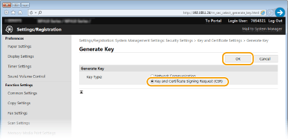 حدد [Key and Certificate Signing Request (CSR)] وانقر فوق [OK].