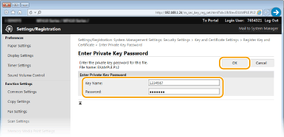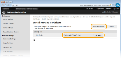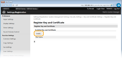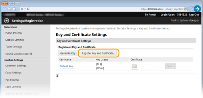 انقر [Key and Certificate Settings] لتثبيت زوج مفاتيح، أو [CA Certificate Settings] لتثبيت شهادة CA.
