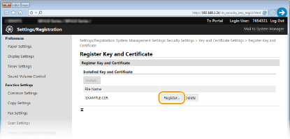 انقر فوق [Register Key and Certificate] أو [Register CA Certificate].