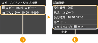 ![]() <コピー/プリントジョブ状況>コピー中または印刷中の文書、順番待ちで待機中の文書などが一覧表示されます。