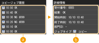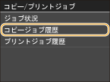 <ジョブ履歴表示のON/OFF>が<OFF>に設定されていると、コピー履歴は確認できません。ジョブ履歴表示のON/OFF