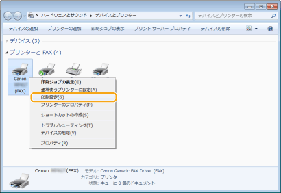 本機のファクスドライバーのアイコンを右クリックし、[印刷設定]をクリックする