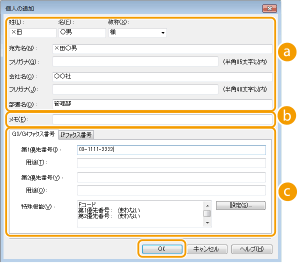 宛先の名称、会社名、部署名などを入力します。[フリガナ]を入力しておくと、宛先を指定するときに50音で宛先を絞り込むことができます。[フリガナ]に入力できる文字は、半角文字(カタカナ、英数字、記号)です。