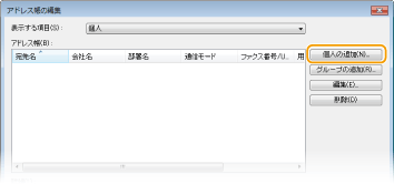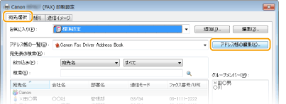 PCファクスで使う宛先をアドレス帳に登録します。登録済みの宛先をいくつか選んで1つのグループとして登録することもできます(グループダイヤル)。グループダイヤルは、複数の宛先にPCファクスするときに便利です。