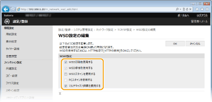 WSDを使用してパソコンから本機の情報を取得するときはチェックマークを付けます。[WSD印刷を使用する]にチェックマークが付いているときは必ずチェックマークが付きます。