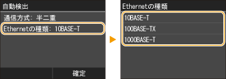 ![]() ![]() <通信方式>が<半二重>に設定されている場合、<1000BASE-T>に設定することはできません。