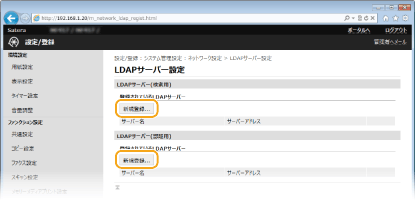 [LDAPサーバー(検索用)]または[LDAPサーバー(認証用)]の[新規登録]をクリックする