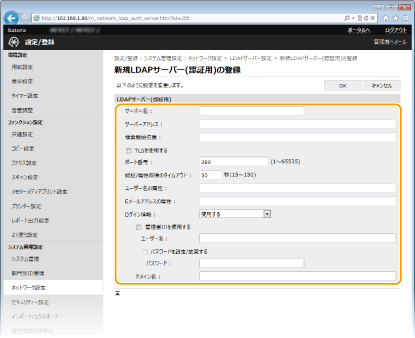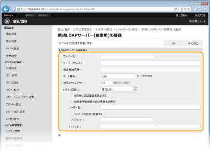 LDAPサーバーが導入されている環境では、サーバーに登録されているファクス番号やEメールアドレスを本機から検索して宛先指定したり、本機のアドレス帳に登録したりできます。また、送信機能の認証設定( LDAPサーバーで認証を行う)が有効になっている場合には、認証に使用するサーバーを登録する必要があります。LDAPサーバーは認証用と検索用にそれぞれ最大5つまで登録できます。なお、登録はリモートUIを使って行います。