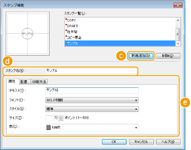 それぞれのタブをクリックして、スタンプとして表示する文字、色や配置などを設定します。各設定項目の詳細については、ドライバー画面の[ヘルプ]をクリックして、ヘルプを参照してください。