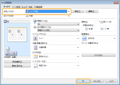 必要に応じて[基本設定]、[ページ設定]、[仕上げ]、[給紙]、[印刷品質]タブから設定を行います。