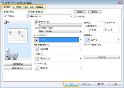 必要に応じて[基本設定]、[ページ設定]、[仕上げ]、[給紙]、[印刷品質]タブから設定を行います。いろいろな印刷設定