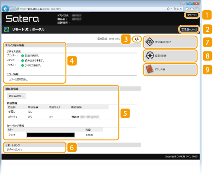 用紙についての情報(残量やサイズなど)やトナーカートリッジ残量が表示されます。