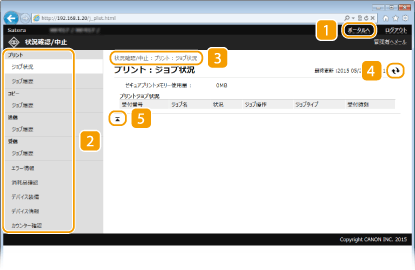[状況確認/中止]ページが開きます。印刷、コピー、ファクスの待機文書について、状況の確認、履歴の確認、処理の中止ができます。