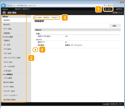 [設定/登録]ページが開きます。管理者モードでログインしているときは、設定内容を変更したり、設定データの保存/読み込みをしたりなどの操作ができます。