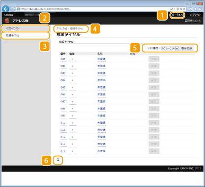 [アドレス帳]ページが開き、登録されている宛先が一覧表示されます。管理者モードでログインしているときは、アドレス帳の登録/編集ができます。
