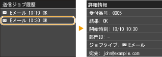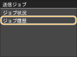 <ジョブ履歴表示のON/OFF>が<OFF>に設定されていると、送信履歴は確認できません。ジョブ履歴表示のON/OFF
