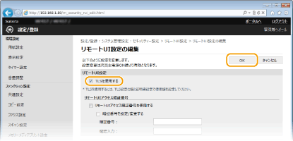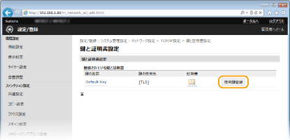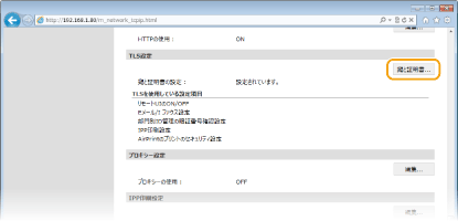 リモートUIによるパソコンのウェブブラウザーとの通信をTransport Layer Security(TLS)を使って暗号化できます。TLSはネットワーク上で情報を暗号化して送受信するための仕組みです。リモートUIを使ってIPSec通信(事前共有鍵方式)の設定をしたり、IEEE 802.1X認証(TTLS/PEAP)やSNMPv3の設定をするときはTLSを有効にする必要があります。リモートUIでTLS暗号化通信を行うには、使用する鍵ペアを指定してからTLSを有効にします。使用する鍵ペアはあらかじめ用意しておいてください(鍵ペアと電子証明書の設定をする)。
