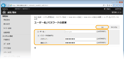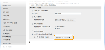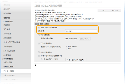 IEEE 802.1X認証のログイン名とは違うユーザー名を設定するときは、[ユーザー名にログイン名を使用する]のチェックマークを外します。IEEE 802.1X認証のログイン名と同じユーザー名にするときは、チェックマークを付けた状態にしてください。