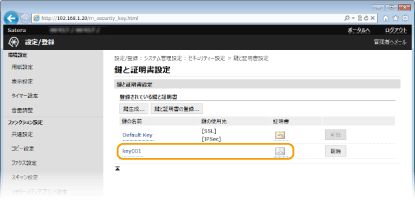 使用中の鍵ペアには「TLS」や「IEEE 802.1X」などの使用目的が表示され、この状態では削除できません。目的の機能を解除するか、別の鍵ペアに変更してから削除してください。