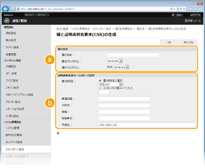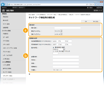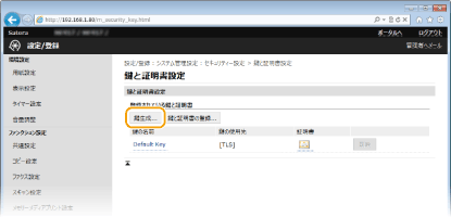 Transport Layer Security(TLS)を使った暗号化通信に必要な鍵ペアを生成できます。TLSは、リモートUIを使って本機にアクセスするときに使用できます。本機に登録できる鍵ペアはプリインストールされている鍵ペアと合わせて最大5つです。「ネットワーク通信用」に生成した鍵ペアでは自己署名証明書が使われます。「鍵と証明書署名要求(CSR)」では、本機で生成した鍵ペアに対して認証局発行の電子証明書を申請することができます。