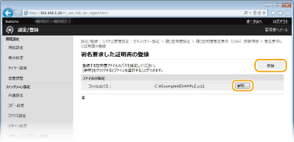 [参照]をクリックし、証明要求した証明書のファイルを指定したあと、[登録]をクリックする