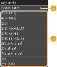 You can enlarge or reduce copies by using a preset copy ratio such as <A5->A4>, or by setting a custom copy ratio in increments of 1%.