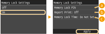 To store received documents into memory, set <Memory Lock Settings> to <On>. You can also specify optional settings such as a security setting that makes a password necessary to unlock the feature and a time setting that specifies a period of time during the day in which received documents are stored in memory.