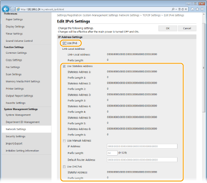 The IPv6 addresses of the machine can be configured via the Remote UI. Before setting IPv6 addresses, check the IPv4 address settings (Viewing IPv4 Settings). You need to set the correct IPv4 settings to use IPv6 addresses. Note that the scan function that uses the scanner driver or MF Scan Utility is not available in an IPv6 environment. The machine can use up to nine of the following IPv6 addresses: